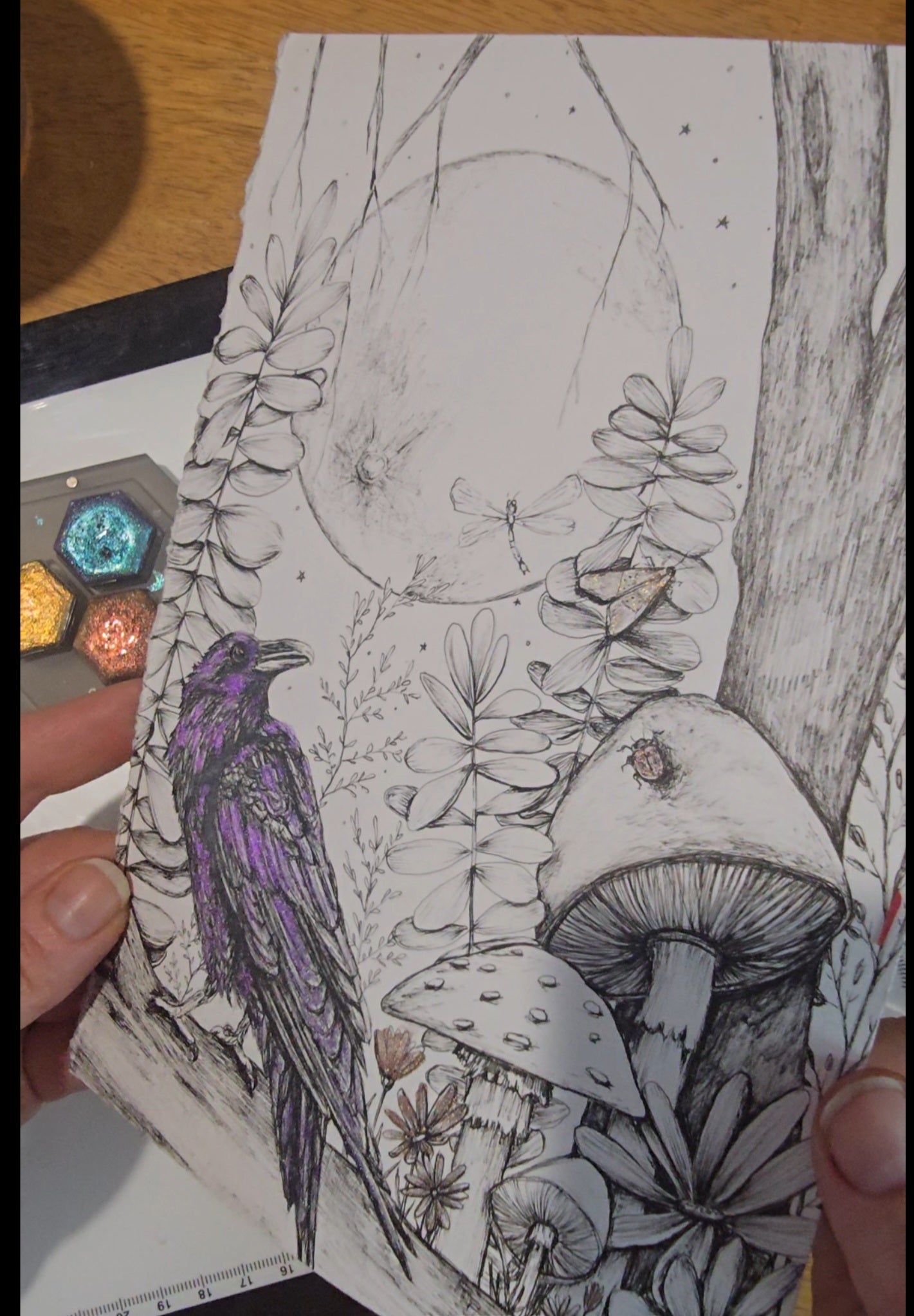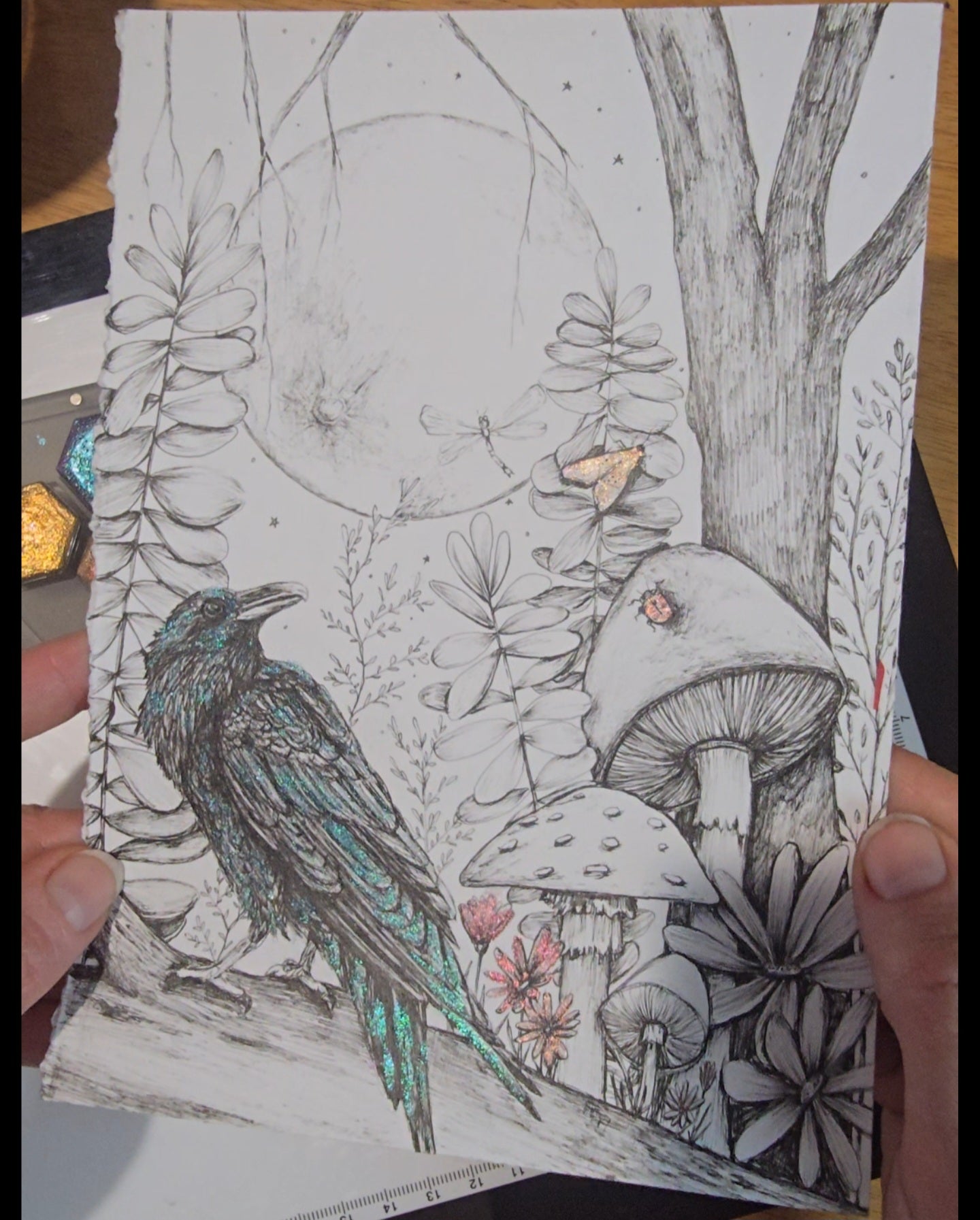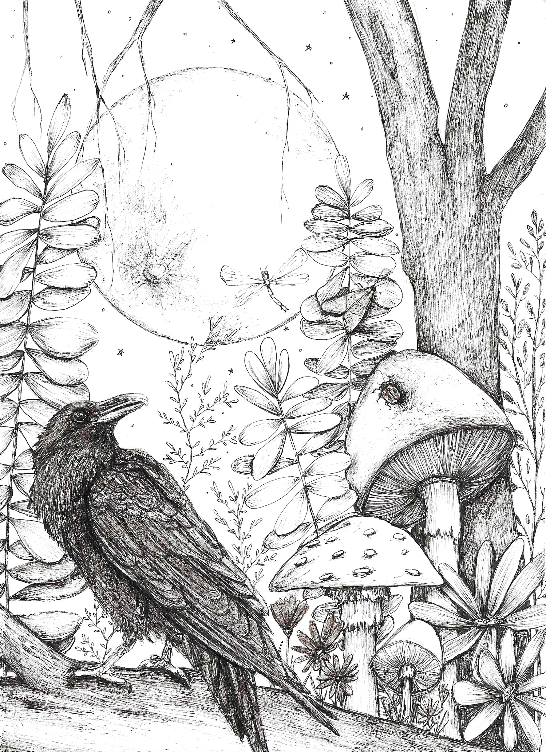 Beneath the watchful eye of the full moon, the forest becomes a sanctuary of whispers and wonder. I created this piece to honour the quiet magic that lives in the liminal—the hush between day and night, the stillness where transformation begins. The crow, the dragonfly, the mushrooms—they are messengers of change, of cycles, of unseen truths. This drawing is my offering to the wild, to the feminine, to the mystery. It’s a reminder that even in darkness, there is beauty, and even in silence, there is story.