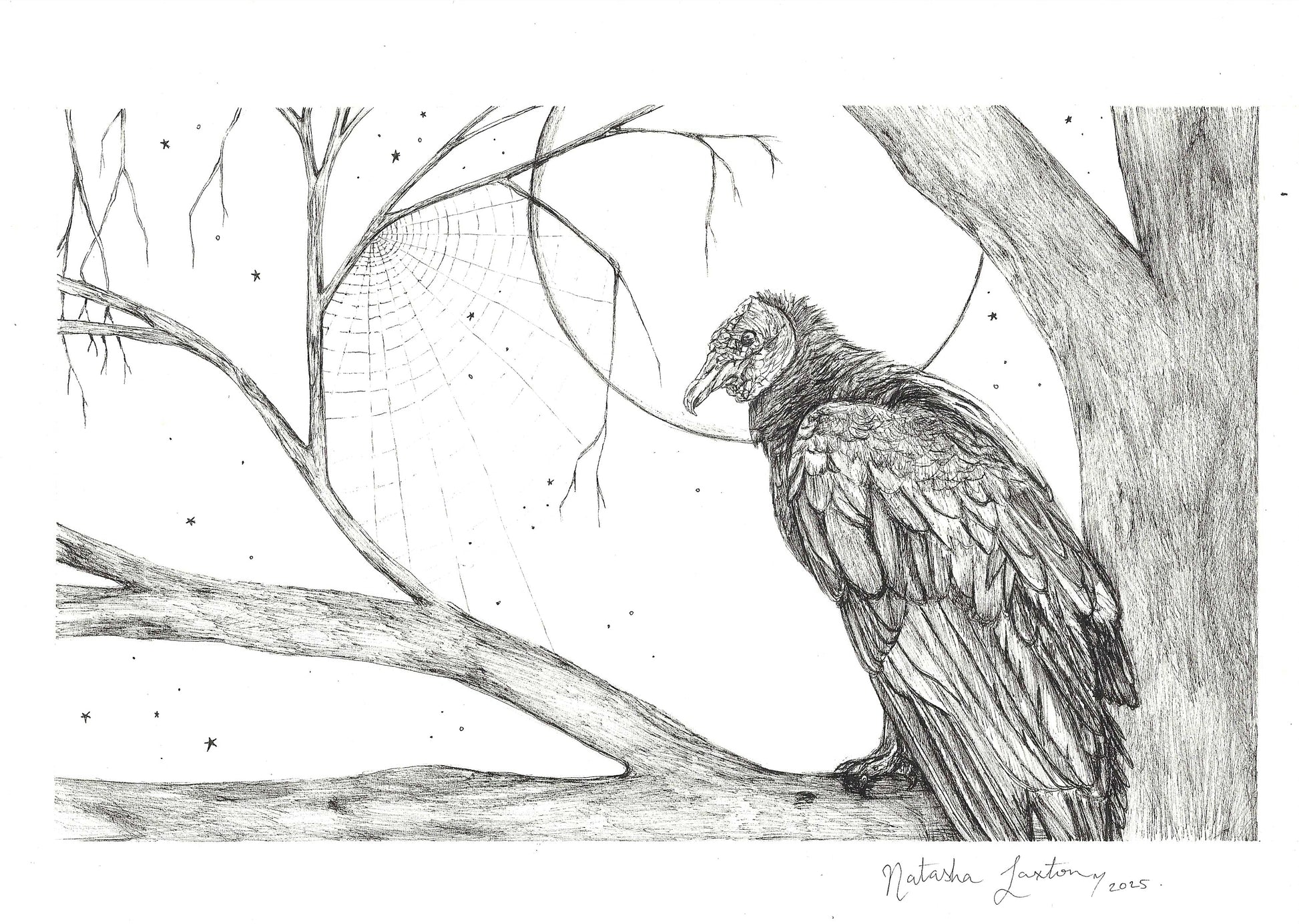 A lone vulture perches in quiet command, its feathers etched with reverence and precision. Suspended behind it, a delicate spider web glimmers between bare branches—fragile yet persistent. Sparse stars punctuate the sky, amplifying the hush of dusk or dawn. The raw cotton paper lends texture to the scene, enhancing the sense of restraint and vulnerability.